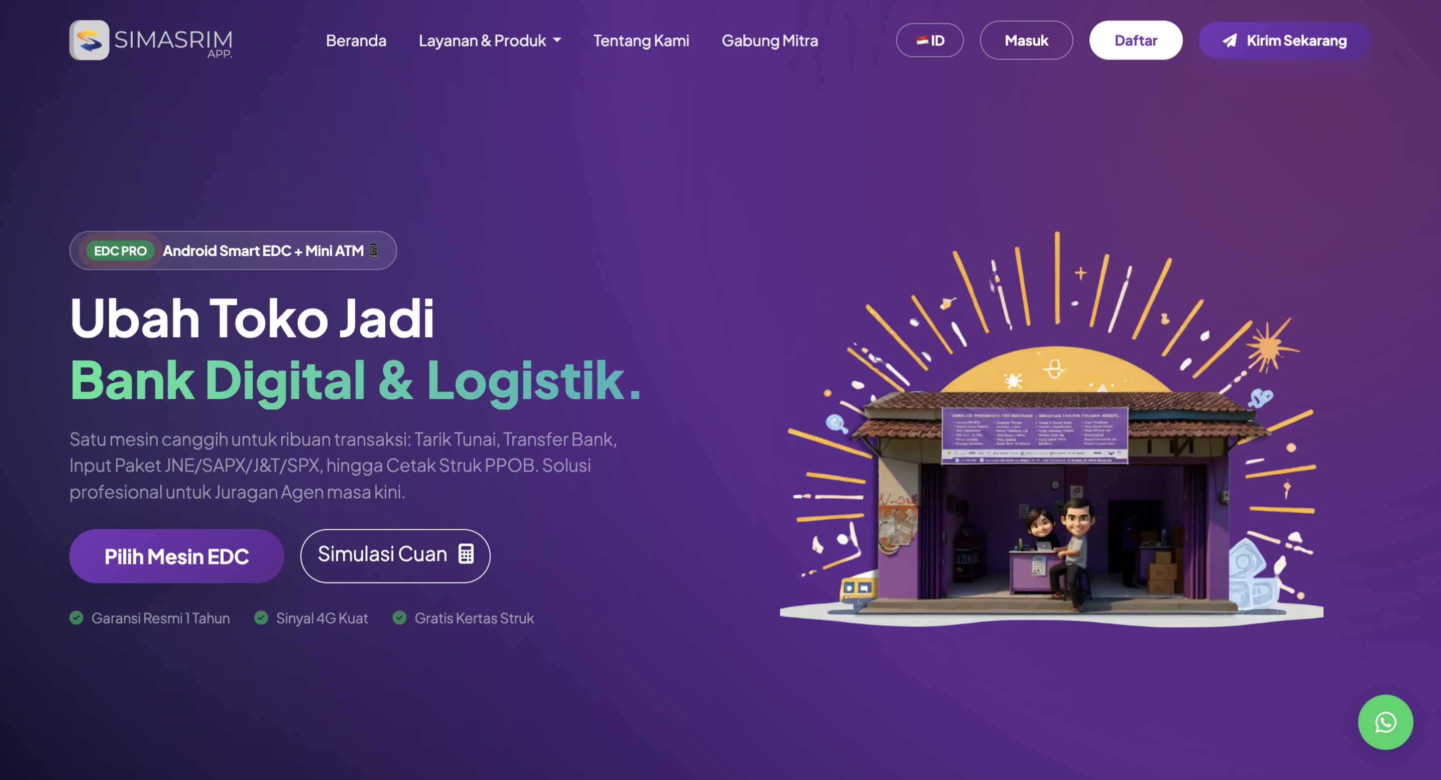 Terima transaksi Mini-ATM, pengiriman paket, dan semua kemudahan SIMASRIM dalam satu perangkat.